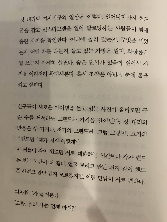 여기서 등장하는 정 대리는 SNS에 하루 일과를 올리고, 여자친구와 같이 어딜 가든지 사진만 몇 백장 찍고 올리는 보여주기 일상을 사는 인물로 나옵니다.